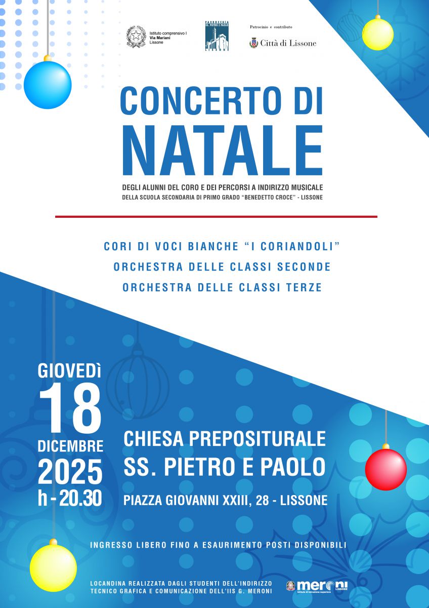 Il Concerto di Natale degli alunni del Coro e dei Percorsi a Indirizzo Musicale della Scuola “Benedetto Croce” di Lissone celebra la magia del Natale attraverso le voci e i talenti dei giovani musicisti. Un appuntamento aperto alla comunità per condividere musica e atmosfera festiva. ??